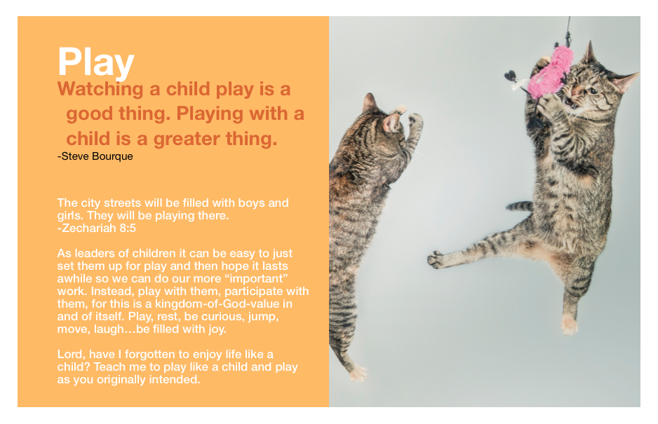 Stress. Can you feel your stomach tighten and your face contort just thinking about that word? Children can be a source of stress, but play is a wonderful antidote to anxiety. Play can soften the toughest of kids and play can bring about greater family or group health. Most importantly, play is a gift from God to be fully enjoyed. Understandably, play cannot be perfectly enjoyed until the New Earth comes, but we can share in glimpses of that great hope to one day come! What are some ways you’ve seen play reduce stress?